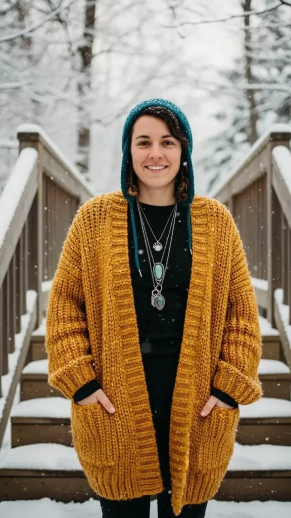 Oversized cardigans are cozy layers that work well under a jacket or on their own during milder snow days. Pair with layered necklaces to give personality and style without adding bulk. Beanies keep your head warm without fuss. To save money, buy cardigans from discount retailers or knit your own. Layer necklaces from inexpensive sets or DIY from old jewelry pieces. This look keeps you warm and fashionable effortlessly.