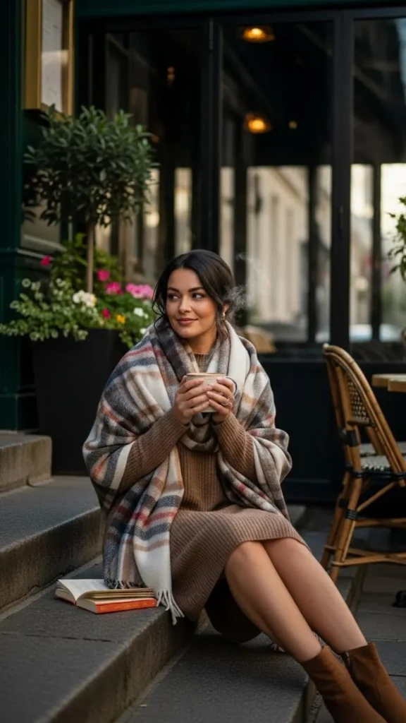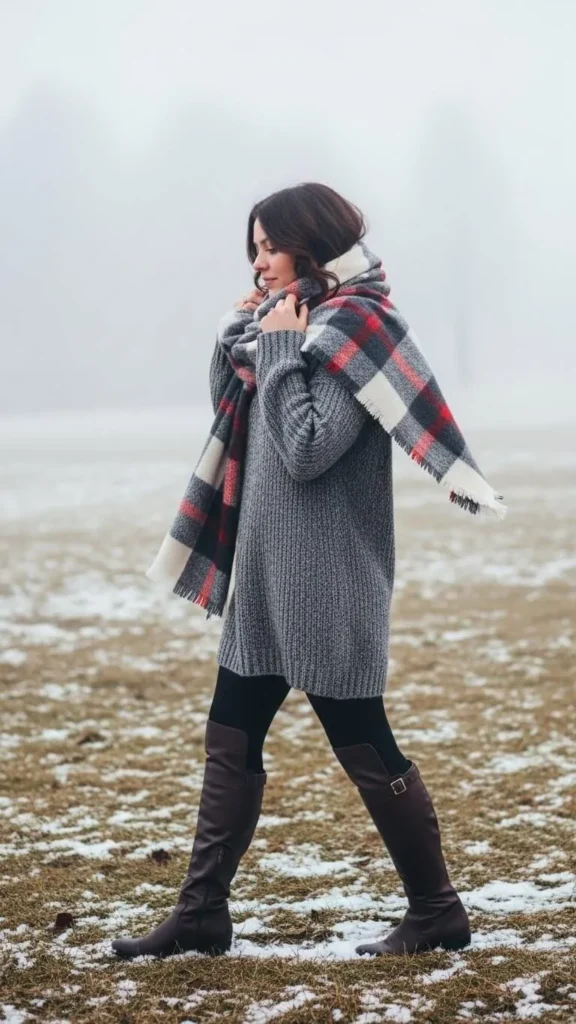 Wrap a plaid blanket scarf around your sweater dress for a classic winter look. Scarves like these add pattern and warmth. You can often find them at discount shops or local markets during winter. This look is simple but feels put-together and cozy, perfect for chilly days.
