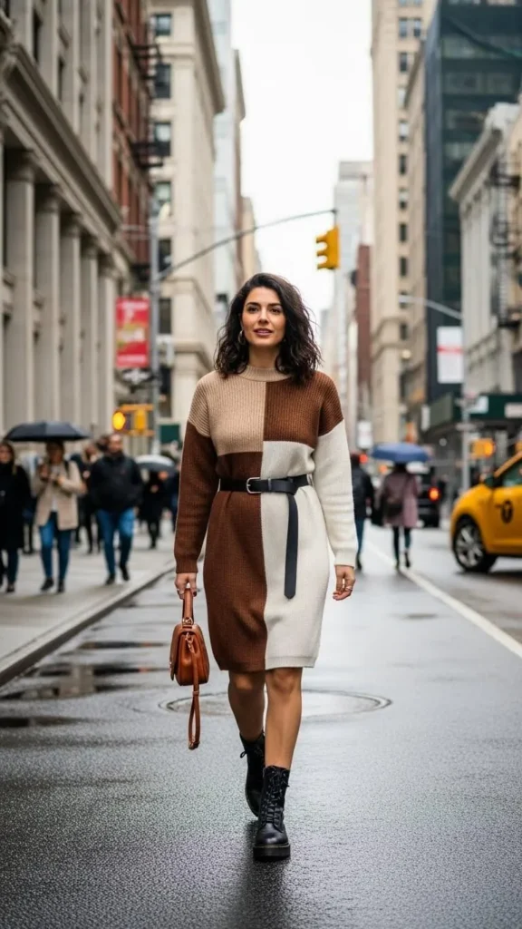 Choose a color-blocked sweater dress for a modern twist. Balance it with sturdy combat boots for a street-ready look. Combat boots are often available at off-price stores or thrift shops. This outfit keeps things neutral but with a touch of boldness from the design.