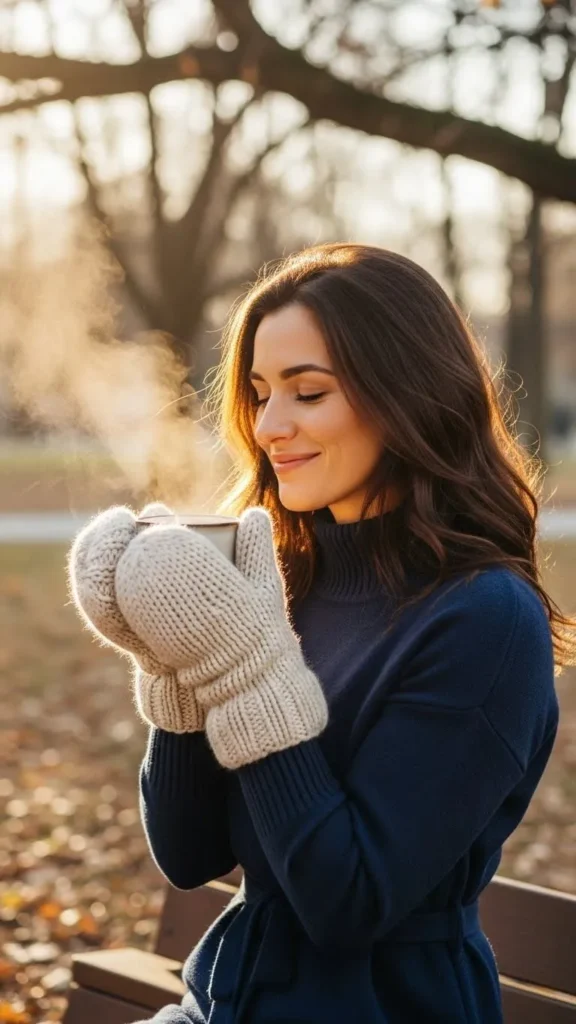 Add chunky knit mittens for extra coziness. Mittens are easy to DIY with thick yarn or find cheaply in stores. They complement a sweater dress and keep hands warm in frigid temperatures. Style with scarves and hats in matching or complementary colors.