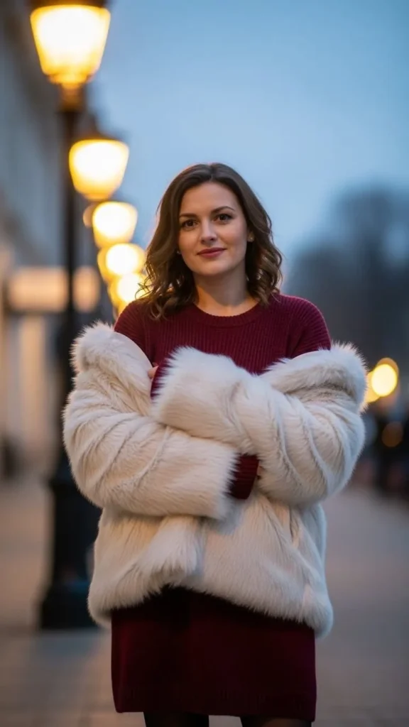 For special occasions, pair your sweater dress with a faux fur coat. Faux fur adds luxury vibes without the expense of real fur. Look for sales or well-reviewed budget brands. Keep boots or shoes simple to let the coat shine. This outfit keeps warm and looks festive.