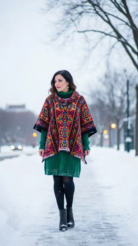 12. Sweater Dress with Patterned Poncho