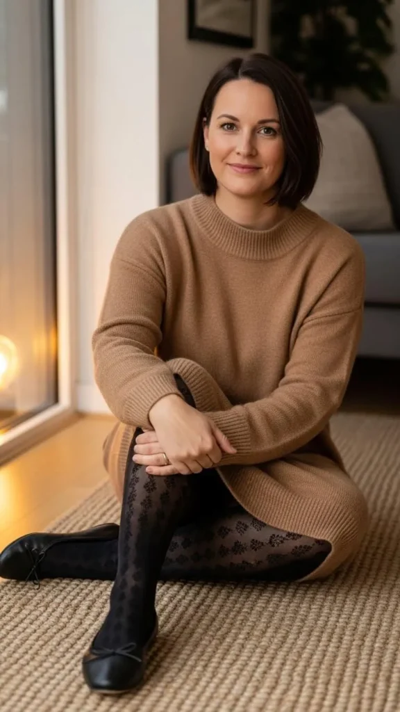 7. Sweater Dress with Patterned Tights and Flats