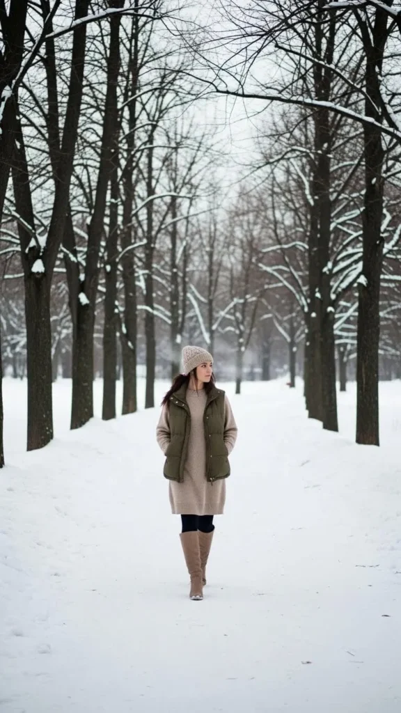 Put a puffy vest over your sweater dress for extra insulation without bulk. Choose neutral colors to keep the look unified. Pair with tall leather or faux suede boots to finish. Vests can be found inexpensively in clearance racks. This outfit works well for outdoor winter strolls, providing warmth and style in one straightforward setup.