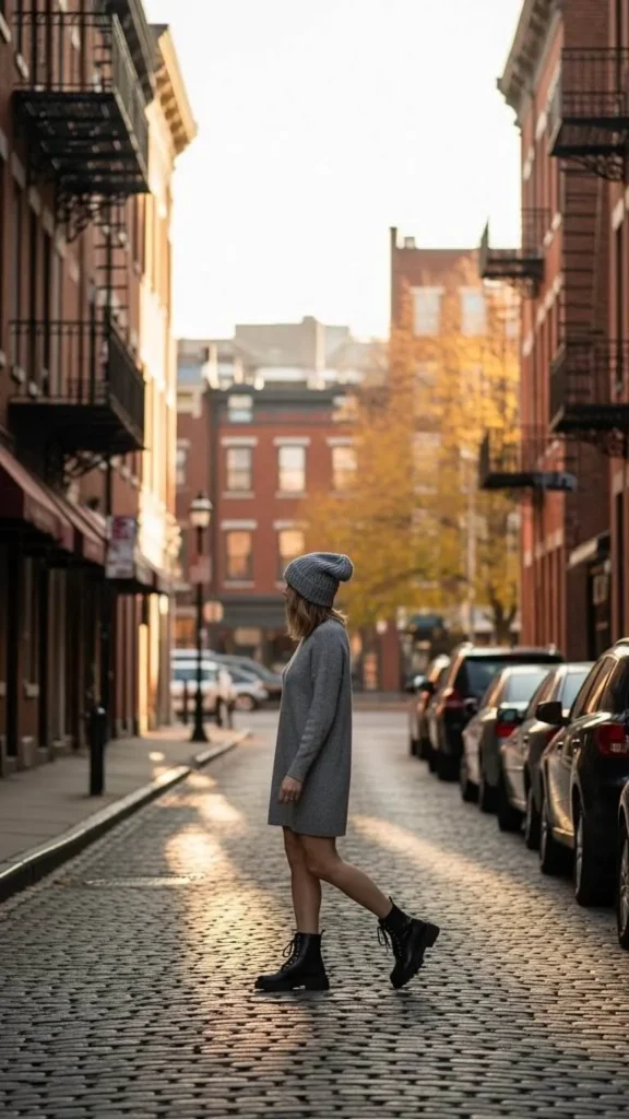 Add a slouchy beanie to your sweater dress for warmth and casual flair. Match with chunky lace-up or combat boots to ground the outfit. Beanies are budget-friendly and easy to find in winter. Boots can be thrifted or purchased seasonally on sale. This look is great for running errands or weekend casual.
