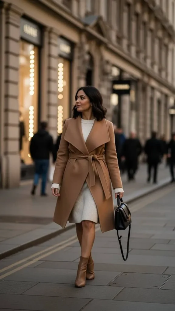 Layer your sweater dress with a wrap coat for warmth and sophistication. Wrap coats are flattering and practical, often found discounted after winter. Add a belt to the coat or dress to define your waist if desired. This easy layering trick adds class to any winter day.