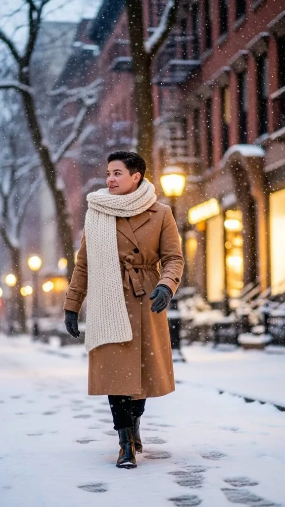 Combine your trench with leather pants and a long wool scarf. Leather or faux leather creates warmth and edge, perfect for casual or evening outings. Wool scarves add coziness around your neck. Buy secondhand leather pants or affordable faux options for a budget-friendly look. This combo adds texture variety to your trench coat winter styling.