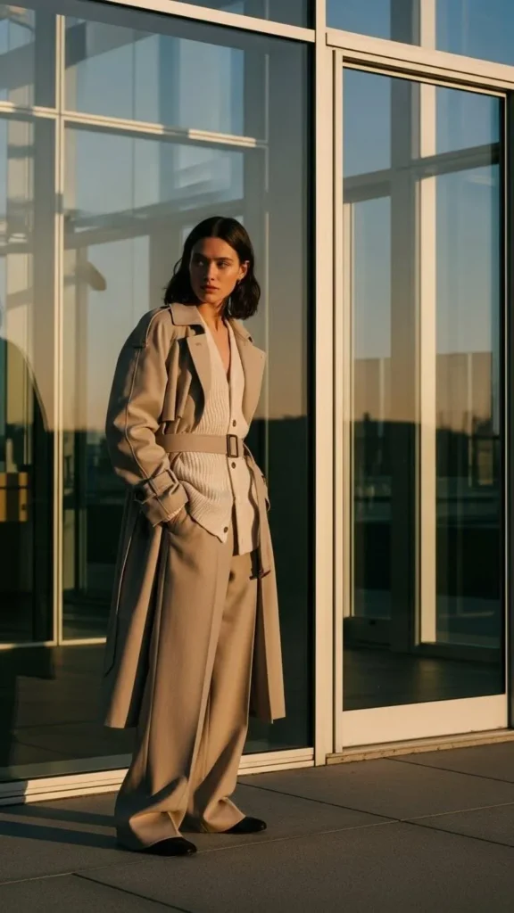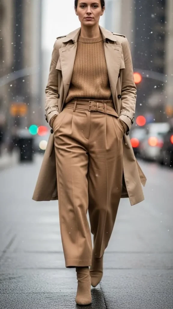 Create a monochromatic outfit by mixing beige tones in your trench coat, knitwear, pants, and footwear. This strategy looks clean and effortlessly stylish. Look for affordable basics in earth tones from budget stores or sales racks. Monochrome is easy to assemble and visually appealing in winter when colors tend to be muted. Add a cozy scarf or hat to finish.