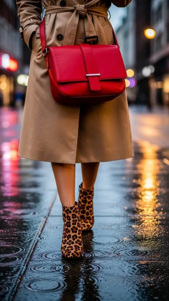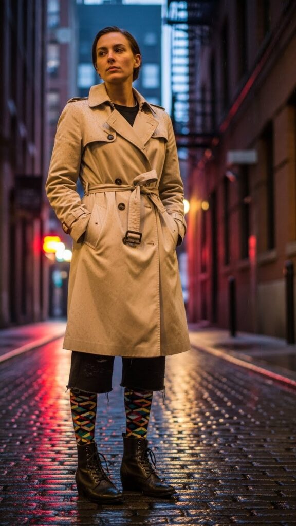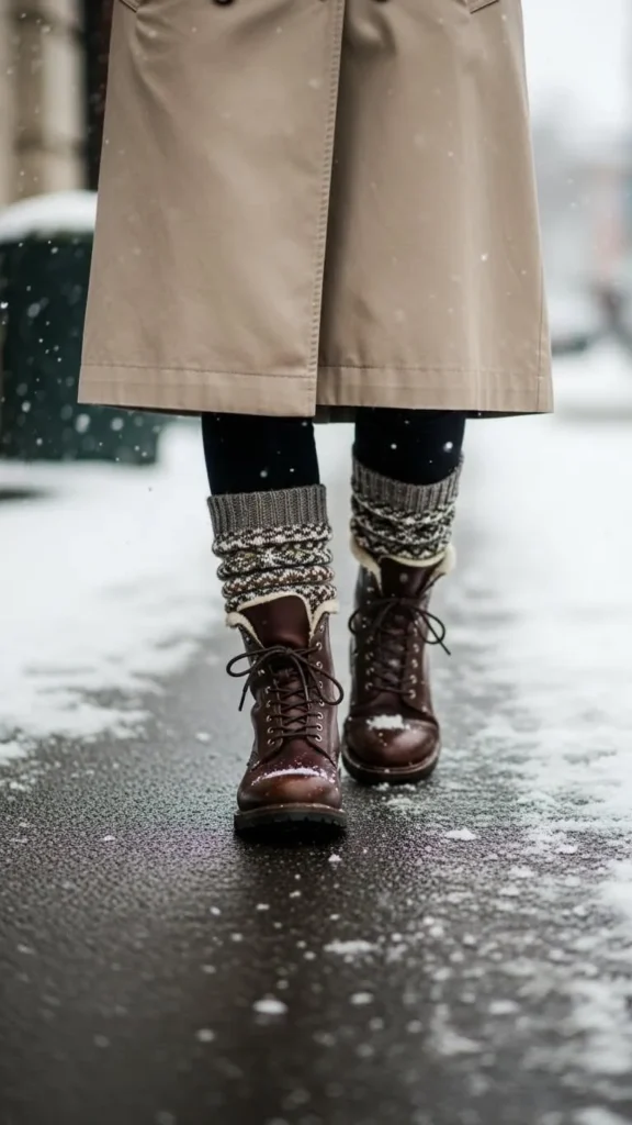 Add a subtle pop of color by wearing patterned socks with your boots and trench coat. It’s a small detail that warms your feet and lifts your outfit. You can find affordable knit socks online or knit your own to customize colors. This small styling trick is budget-friendly and practical on chilly days.