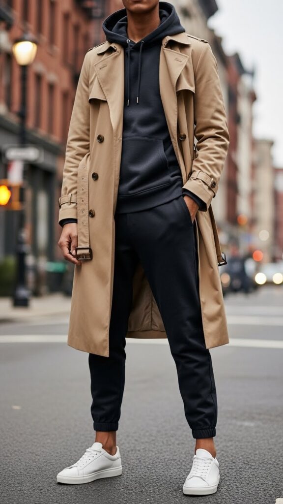 4. Trench Coat Over a Hoodie and Joggers