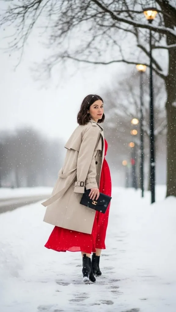 If you own a bright or patterned winter dress, drape your trench coat over your shoulders to keep warm but show off the dress. This is practical when indoors or for photo-ready moments outside. Find affordable warm dresses on sale or use layering pieces for warmth underneath. The trench keeps the focus on your statement dress while adding light warmth.