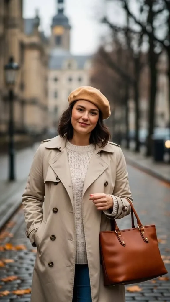 22. Trench Coat with a Warm Beret and Leather Tote