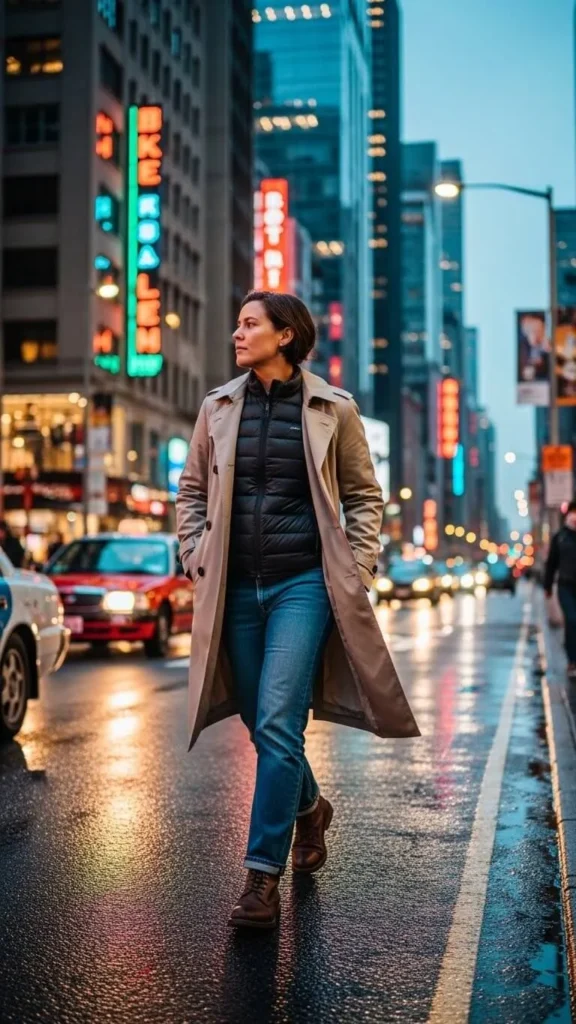 If you want an extra layer without heaviness, wear a thin down vest under your trench coat. It traps body heat easily and keeps your core warm. Lightweight down vests are often on clearance or available at outlet stores. This style fits perfectly if you want warmth but don’t want a heavy winter coat. Pair with casual jeans and boots.