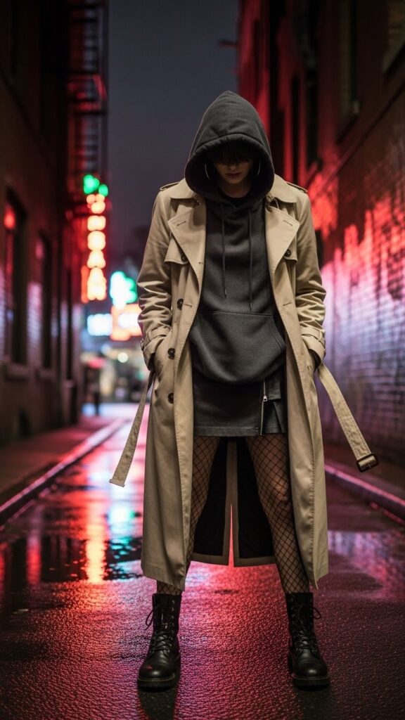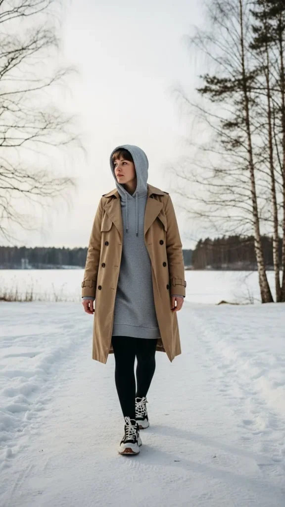 Use a hoodie dress as your winter base layer. Put the trench coat over it for structure and extra warmth. Black opaque tights keep your legs cozy. This look is simple, comfortable, and easy on the budget. Hoodie dresses are often found on sale or DIY-friendly with old sweatshirts. Layering this way is perfect for casual weekends.