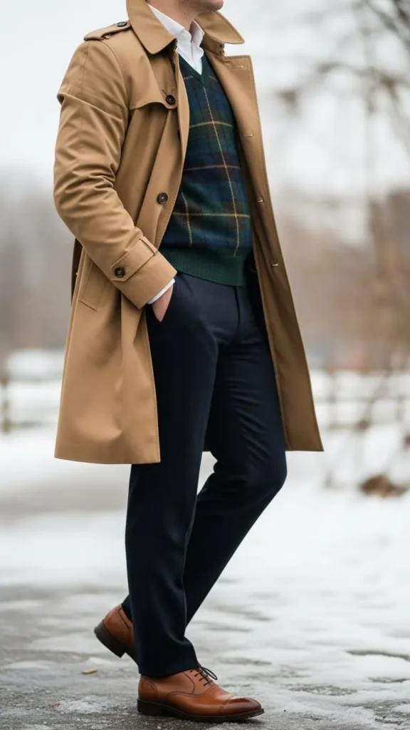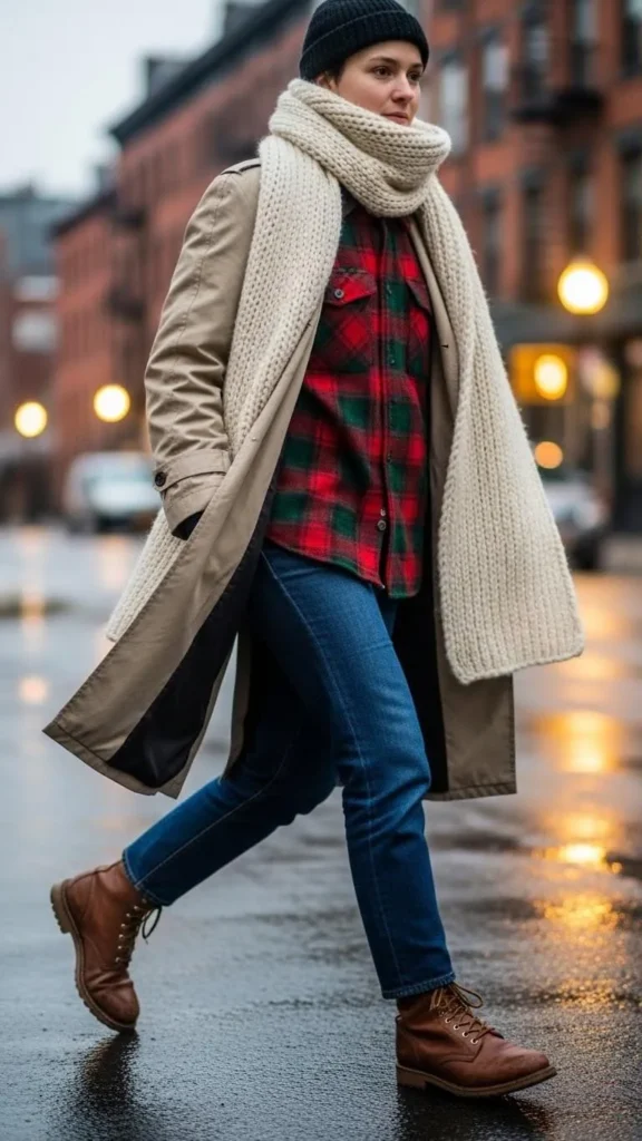 Layering is key here. Pair your trench with a plaid flannel shirt and a chunky scarf wrapped around your neck. This combo gives a rustic, cozy touch. Flannel shirts are usually inexpensive and durable. Don’t forget thermal tops underneath for extra insulation if it’s very cold. The scarf can be bought on a budget or knitted at home to add warmth and a pop of pattern.