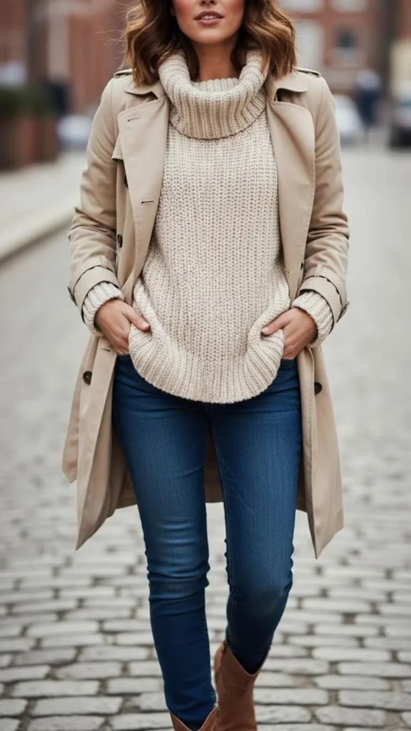 Start with a thick knit sweater underneath your trench coat. Choose neutral colors like cream or gray for easy mixing. Add skinny jeans for balance and keep your feet warm with leather boots. You can thrift or find inexpensive sweaters that look luxurious. This layering traps heat well. It’s an easy outfit for cold days without making you look bulky. Roll up the trench sleeves to show the sweater texture.