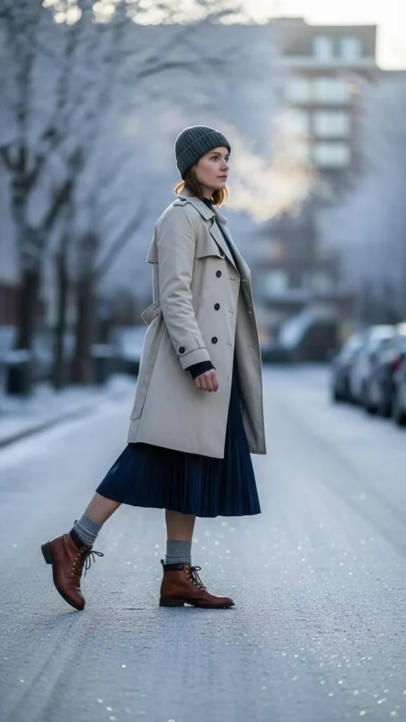 Pair your trench coat with a midi pleated skirt and winter boots for a feminine winter look. This combination keeps your legs covered without feeling bulky. Select skirts in warmer fabrics like wool blends. Use thick tights underneath for insulation. This is an affordable way to make your trench feel fresh and more outfit options open up, even when it’s chilly.