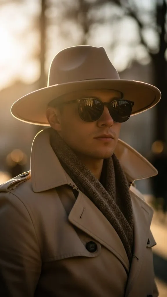 17. Trench Coat Styled with a Fedora and Sunglasses on a Clear Winter Day