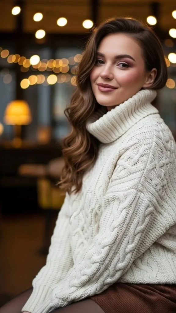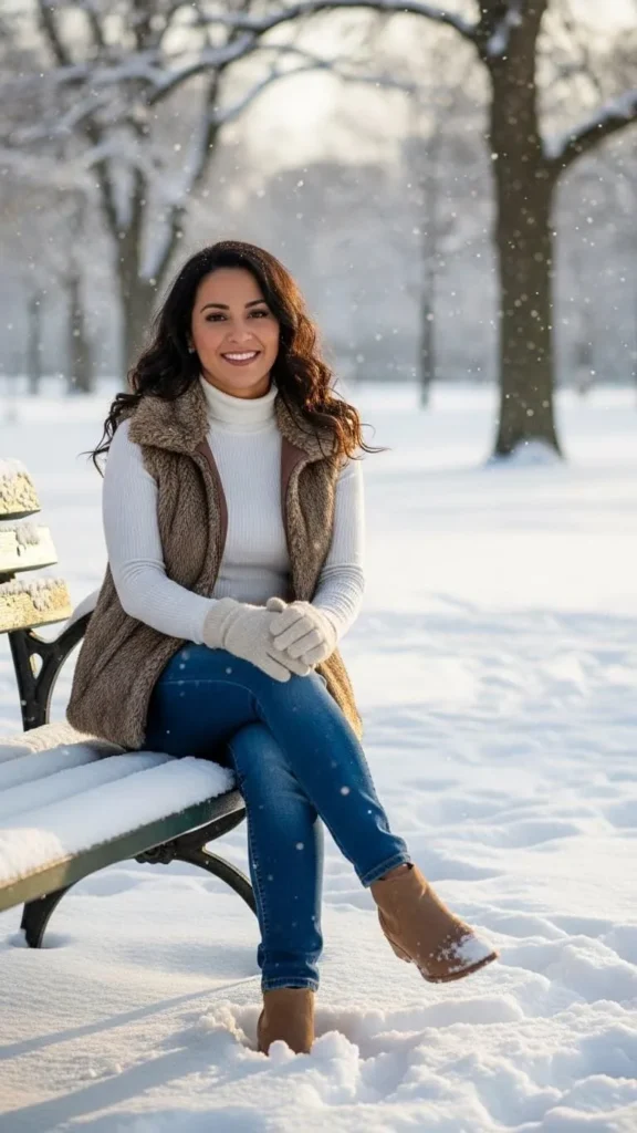 Add a faux fur vest over your turtleneck for instant texture and warmth. Vests are often cheaper than full coats and can be used to layer over different outfits. Pair with jeans and boots for a casual vibe. Look for faux fur options at affordable retailers or thrift shops for budget-friendly luxury.