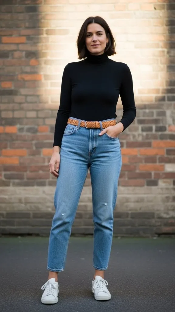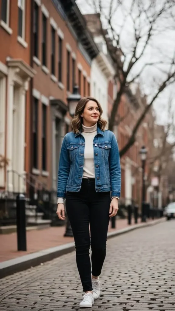 For a casual weekend look, layer a simple turtleneck under a denim jacket. This combo adds warmth and style without extra cost. Swap bulky coats for lighter jackets on milder days. Choose neutrals for the turtleneck and classic blue for the denim to keep it timeless. This outfit is perfect for walks or coffee outings.