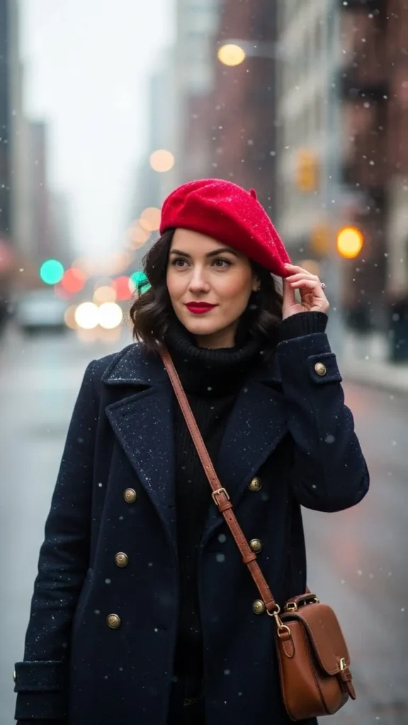 A peacoat paired with a turtleneck and a beret creates classic Parisian-inspired winter style. Peacoats often appear discounted off-season. Pair with simple accessories like scarves and hats for style that feels curated yet affordable. This outfit is perfect for casual outings or city strolls.