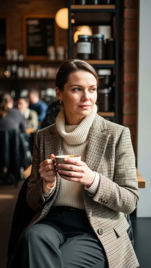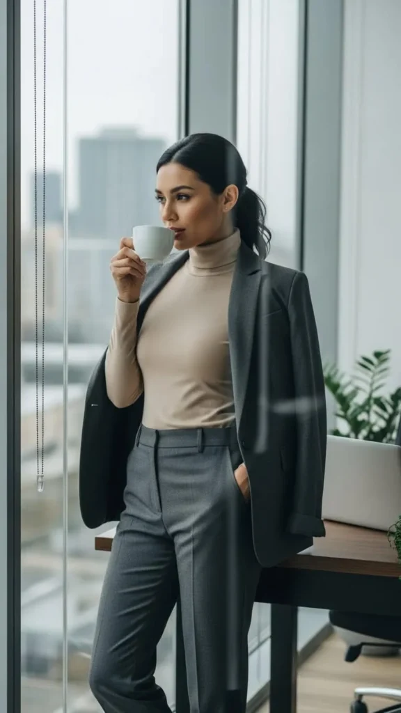 Pairing a turtleneck with a blazer is a great way to look polished yet comfortable. This works perfectly for work or formal events. Go for neutral colors to create mix-and-match options. Thrift or sales sections often have blazers at great prices. This outfit is simple but sharp, proving sophistication doesn’t have to be expensive.