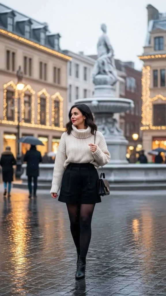 Wool or knit shorts with tights and a turtleneck mix winter comfort with a trendy edge. Look for affordable shorts in sturdy fabrics. Pair with thick tights to keep legs warm. This outfit is great for days when you want to stand out without sacrificing practicality.