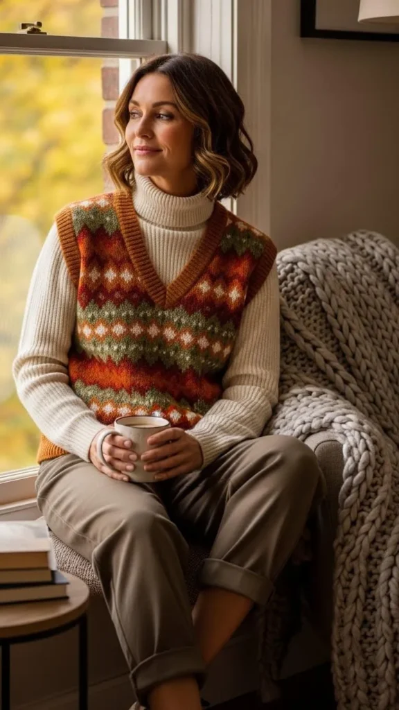 Sweater vests are back in style and pair well over a turtleneck for a warm layered look. You can easily DIY a vest by cutting and finishing an old oversized sweater. Vests add warmth without bulk. Pair with neutral pants for affordability and easy wearing.