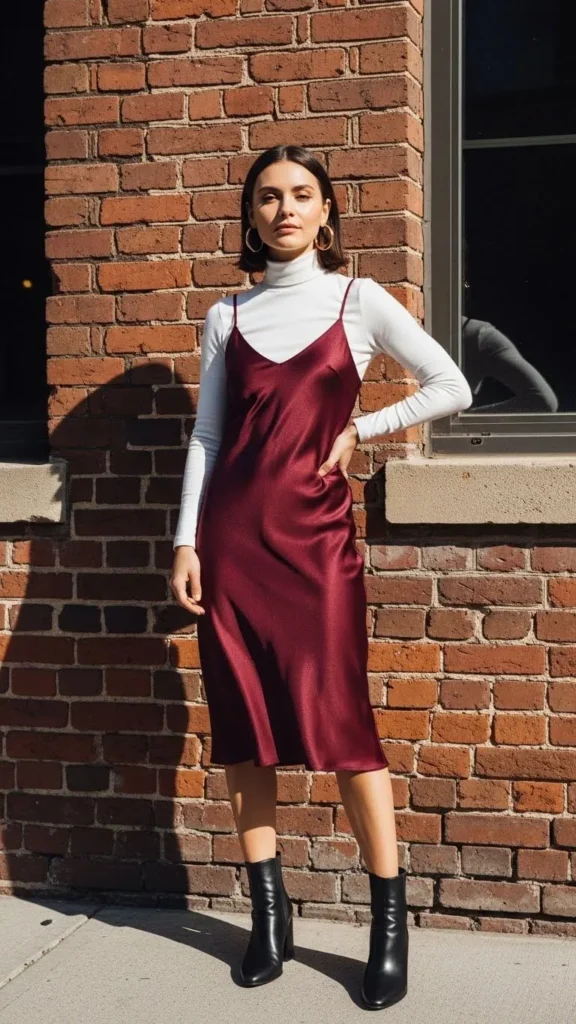 Layering a turtleneck under a slip dress turns a summer staple into winter-ready attire. Opt for a lightweight, fitted turtleneck to avoid bulk. Use dresses you already own to refresh your look. Add tights and boots to stay warm. This style works well for day or night and keeps you stylish without buying an entirely new dress.