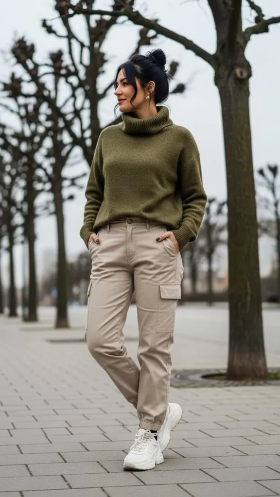 Cargo pants mixed with a turtleneck create a trendy, relaxed style perfect for casual days. These pants are often inexpensive and durable. Tuck the turtleneck in slightly and add sneakers for a laid-back feel. Look for neutral or earth tones to keep things coordinated and easy to wear.