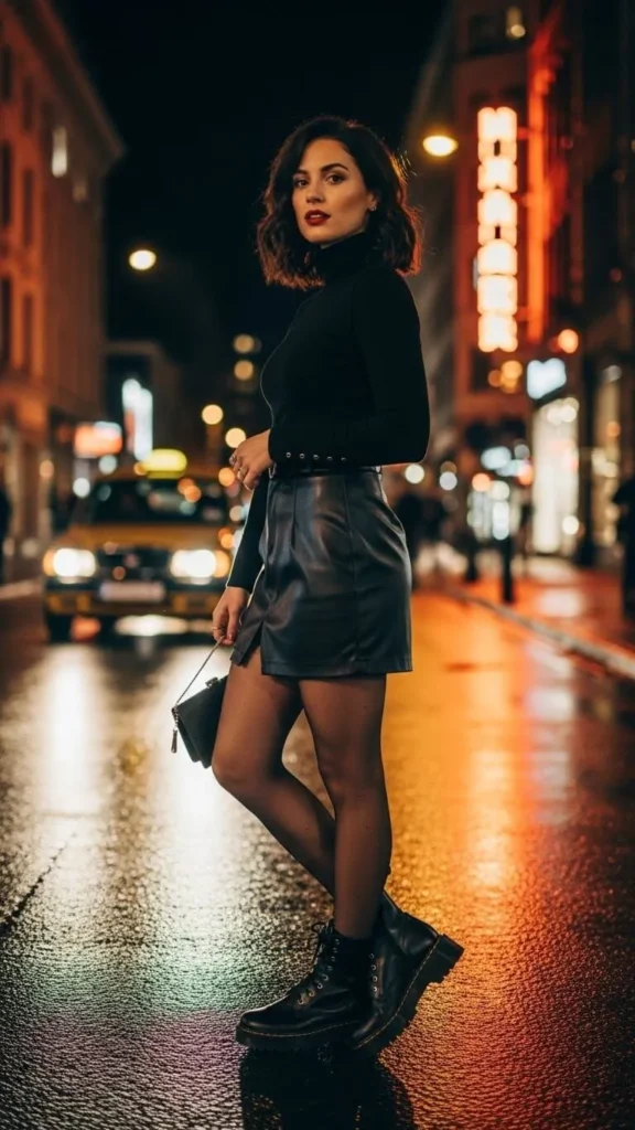 A fitted turtleneck pairs well with a leather skirt for modern, edgy winter style. Faux leather skirts are often affordable and easy to maintain. You can combine black turtleneck basics with statement pieces for a low-cost look. Add tights and boots for warmth and personality.