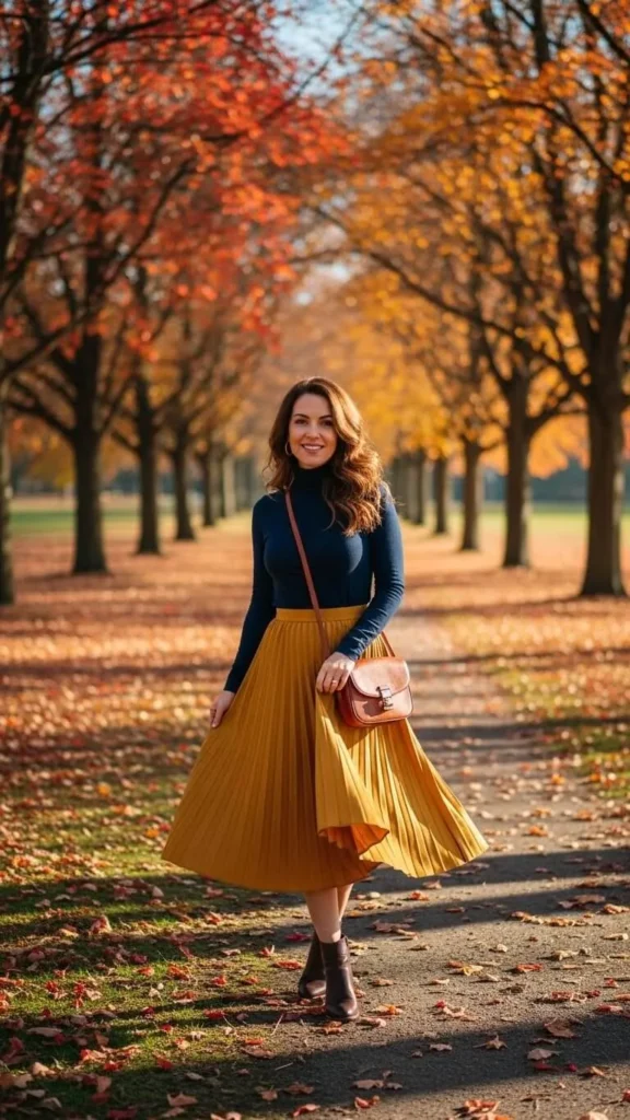 Combine a turtleneck with a midi pleated skirt for a smart, feminine winter look. Tuck your top in to emphasize your waistline. Adding ankle boots keeps it comfortable for walking. Choose affordable skirts from clearance sales or thrift shops. Pleats add movement without extra layers, so you stay warm and stylish easily.
