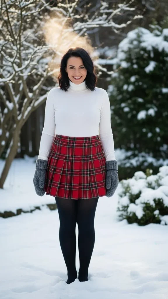 A plaid skirt adds color and pattern when paired with a simple turtleneck. This combination feels festive and fun for winter. Mittens are cheap and easy to knit yourself to add a personal touch. Black tights help keep warm without complicating the outfit. Look for clearance skirts or DIY pleats for affordable style.