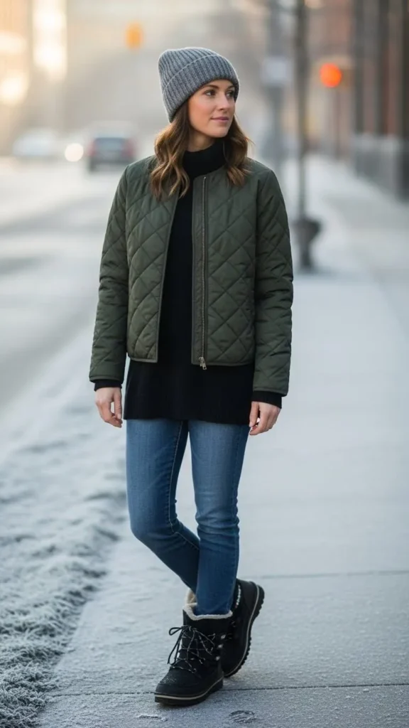A quilted jacket is a lightweight alternative to heavy parkas. Layer a turtleneck underneath for warmth and style. Quilted jackets are available at reasonable prices and can be worn in many styles. Keep jeans and boots simple to focus on warmth and practicality.