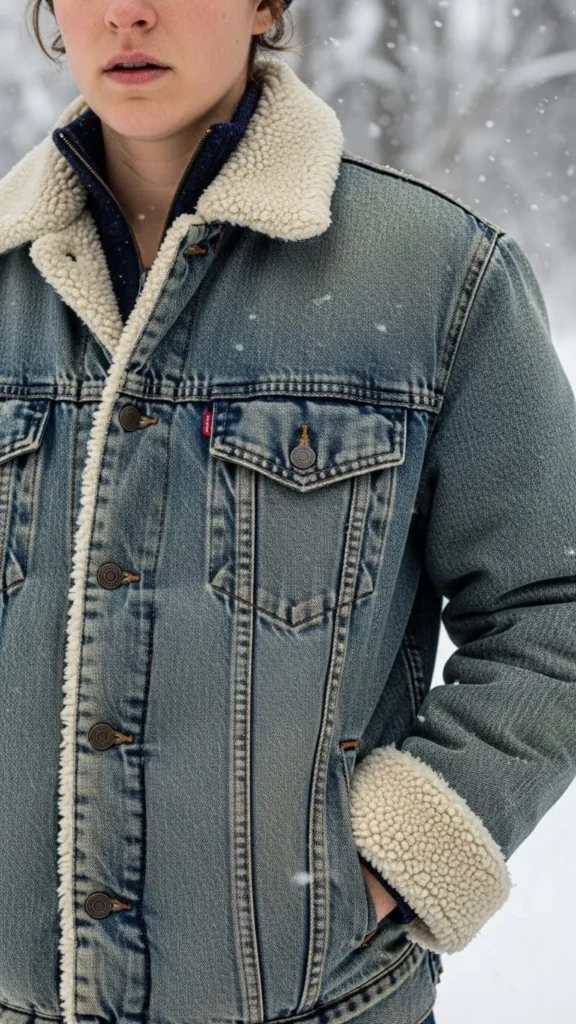 Denim jackets with faux fur lining add a stylish but warm layer for mild winter days. They’re lightweight and easy on the wallet. You can even DIY faux fur lining by sewing old faux fur spare fabric inside a denim jacket sleeves and collar. Pair with thermal tops underneath to stay toasty without bulk.