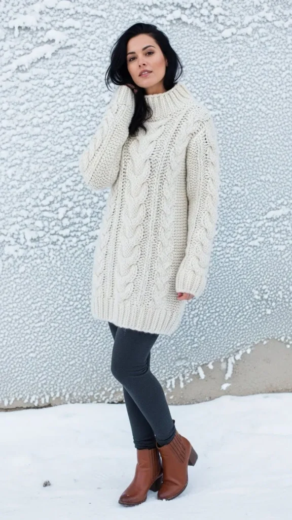 Sweater dresses styled with leggings are a winter staple. Cable knits add texture and warmth without layers beneath. Add a belt for shape or layer with a long coat outdoors. Look for sales or clearance rack pieces in fall for the best prices.