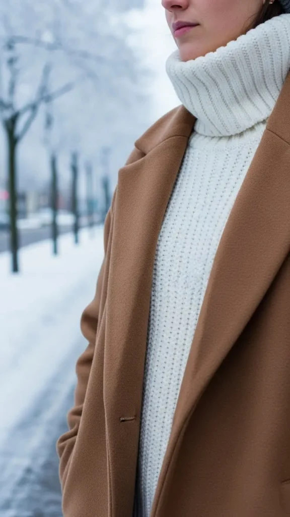 Choose a thick wool coat for your outer layer. Keep a turtleneck knit underneath. This combo traps heat well. Go for neutral colors like beige, gray, or navy for easy mixing. Add a scarf for extra protection. These items can be thrifted or found at affordable stores. They’re durable and timeless. Layering means you can add or remove pieces when indoors or outside. It saves money and keeps you comfy.