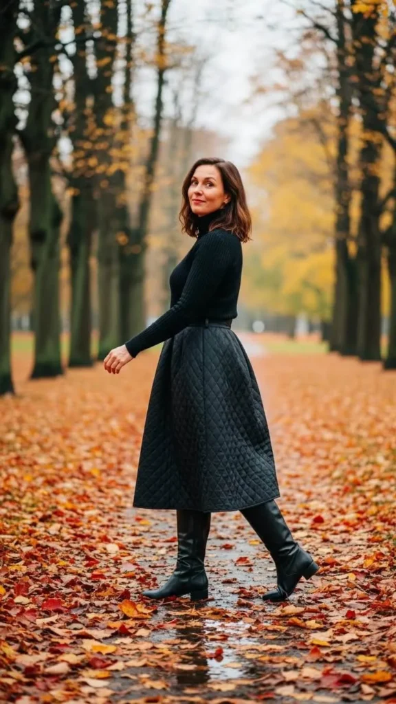 Quilted skirts give you warmth in a trendy way. Pair with thick tights and tall boots. This look works great for office or casual outings. You can find affordable quilted skirts or DIY by quilting fabric overlays on existing skirts to add warmth. Buy tights in multi-packs for better value.