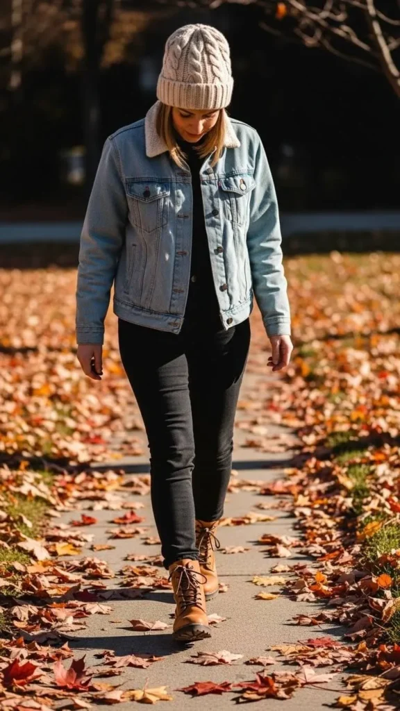 A cable-knit beanie is a winter staple. Pair it with your favorite denim jacket and black skinny jeans for easy layering. Slip on some tan lace-up boots for a casual, grounded look. The knit texture adds warmth and interest without fuss. This outfit works for errands, walks, or coffee meetups. If you want a DIY trick, add a small woven patch or pin to your beanie for a personal touch.