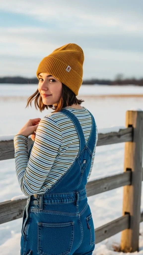 Denim overalls are unexpectedly fun in winter with a warm knit beanie. Add a striped or plain long sleeve underneath and sneakers or boots. Mix and match your beanie color with your existing wardrobe. For an uplifting DIY, add a pom-pom or sew on a small charm to your beanie for extra personality.