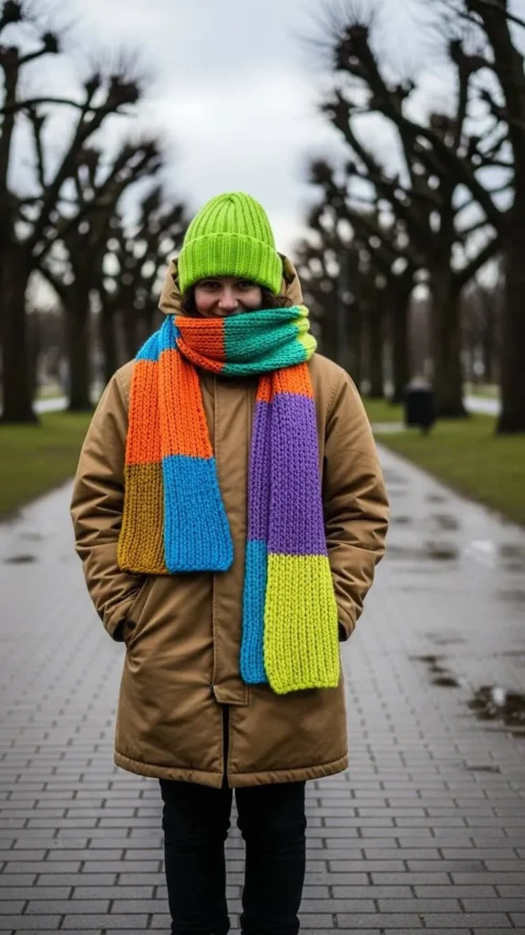 Bright neon beanies brighten the gray winter days instantly. Pair them with your neutral parka and layered scarves to keep cozy. Thrift stores often have scarves to add texture without much cost. A simple DIY is to braid leftover scarf strips into a new bracelet or trim for your beanie.