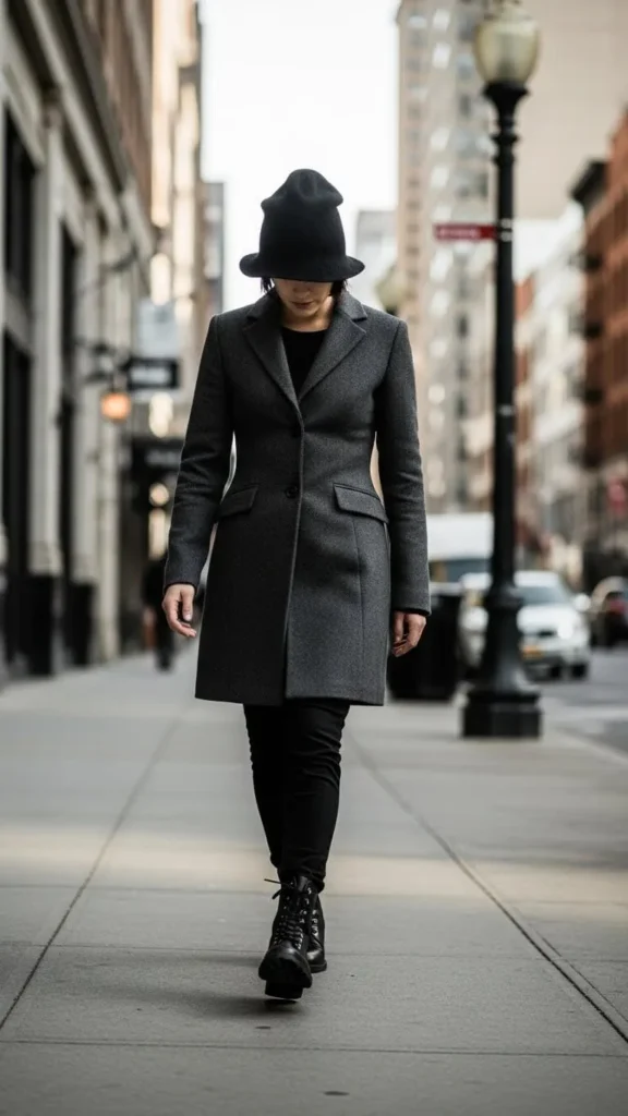 A slouchy beanie softens the sharp lines of a fitted coat. Paired with lace-up boots, this look feels youthful with a subtle edge. Look for quality near-out-of-season coats at discount stores. To personalize the hat, add a small crochet flower or patch made from old sweaters by hand-stitching.