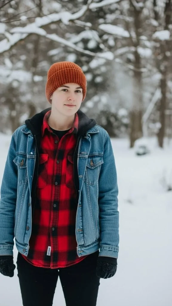 Flannel under denim is a classic that screams laid-back winter style. Throw on a knit beanie in a warm rust or orange shade to feel cozy and youthfully stylish. Both flannel shirts and denim jackets can be found at good prices secondhand. Customize your beanie with simple stitched patterns in contrasting thread colors.