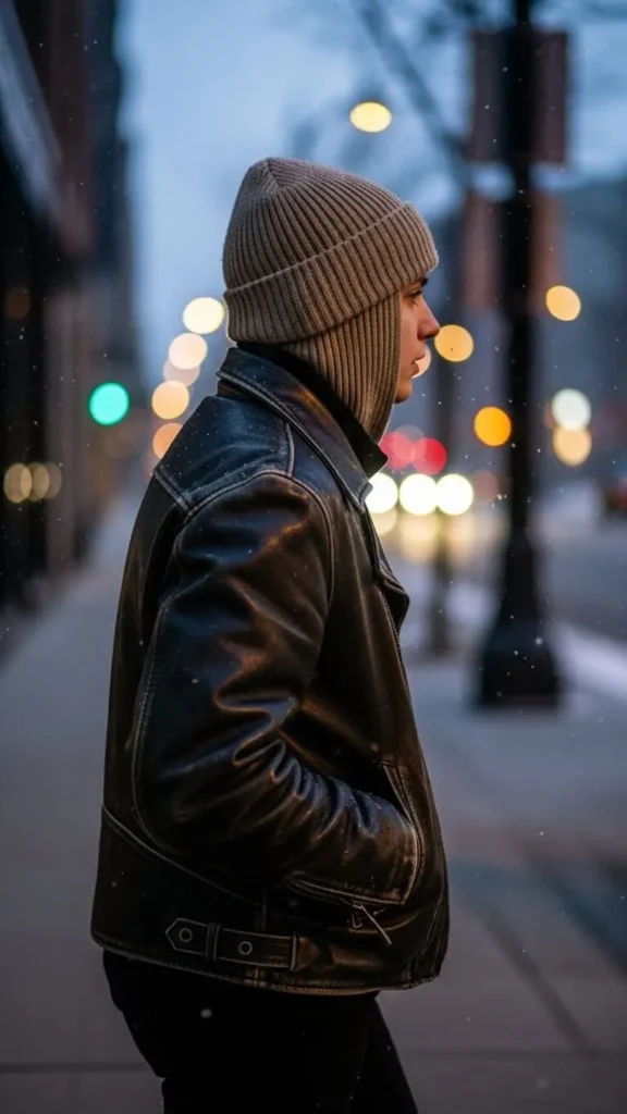 A ribbed knit beanie pairs effortlessly with a leather jacket for a cool, casual contrast. This look is great for those slightly warmer winter days. Choose earth tones or black beanies to keep it versatile. You can personalize a plain beanie by adding a fabric paint design to its cuff, which only takes a few minutes and minimal supplies.