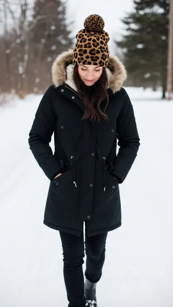 Animal print beanies add a fun twist to plain parkas. It’s a playful and youthful way to add personality. Look for faux fur or printed beanies at thrift or fast fashion shops for budget options. For a no-cost DIY, use fabric paint to add spots or stripes to an existing solid beanie.