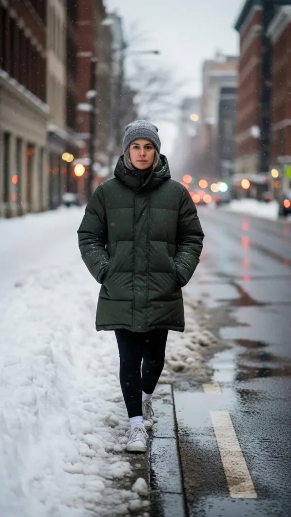 A slouchy beanie complements bulky outerwear perfectly. Wear it with a puffy parka, black leggings, and crisp white sneakers. This keeps the look sporty and youthful. Opt for neutral tones to mix and match pieces affordably. For a budget-friendly hack, give your old beanie a fresh look by sewing on a button or embroidering a simple shape with colorful thread.
