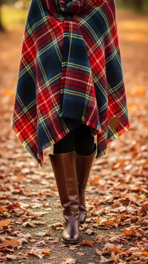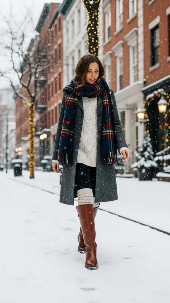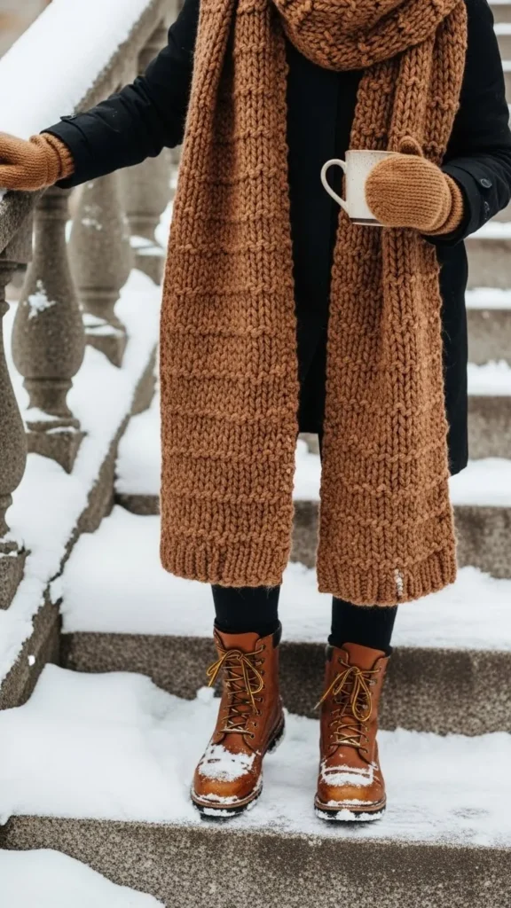 Pile on the blanket scarf and wear tall riding boots for a country-inspired winter look. The riding boots frame skinny jeans or leggings beautifully. The oversized scarf acts like a wearable accessory and keeps the upper body warm. Swap plaid scarves for neutral colors if you want subtle style. Riding boots can last seasons if cared for properly—use waterproof spray to extend life.