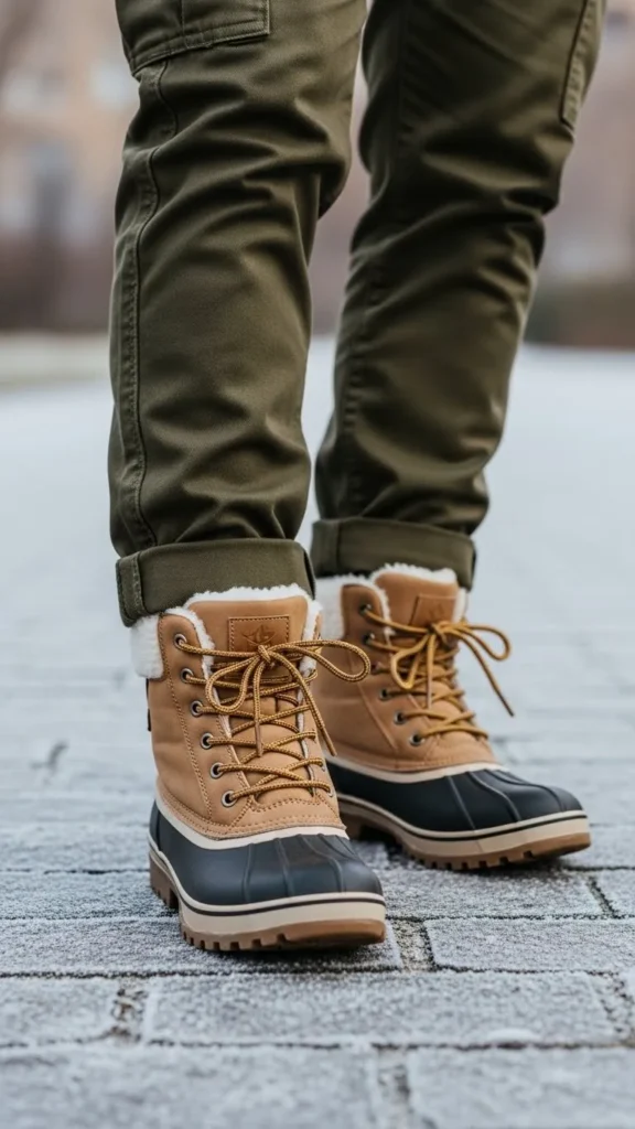 Cargo pants with fleece-lined boots offer effortless winter toughness. Roll up pant cuffs slightly to reveal the lining. Pair with sweatshirts or thermal tops to keep it casual and warm. This look works great for outdoor activities or laid-back days. Affordable fleece-lined boots are common and last well when maintained. Try creating your own cuffs with knit leg warmers if you want extra warmth.