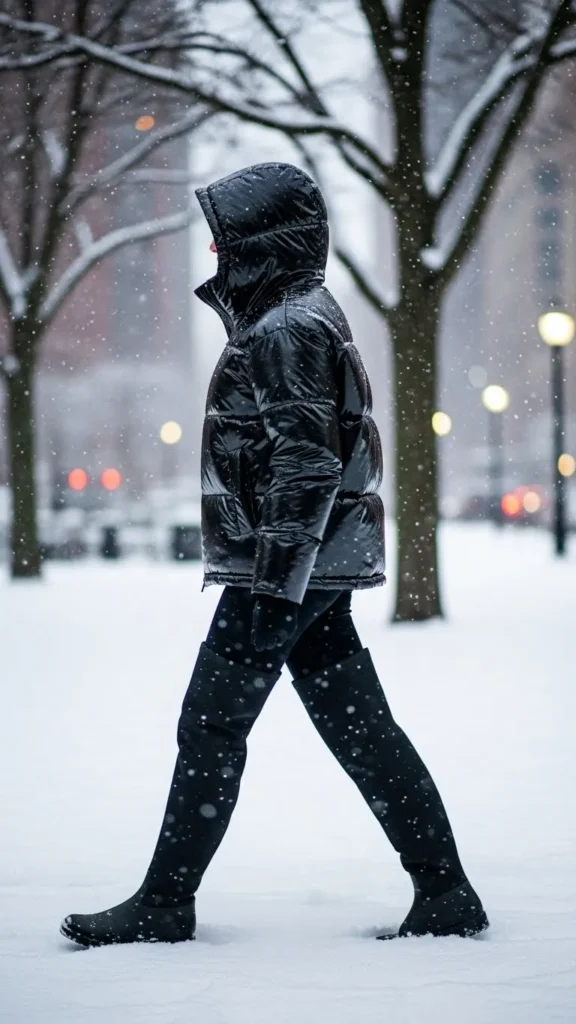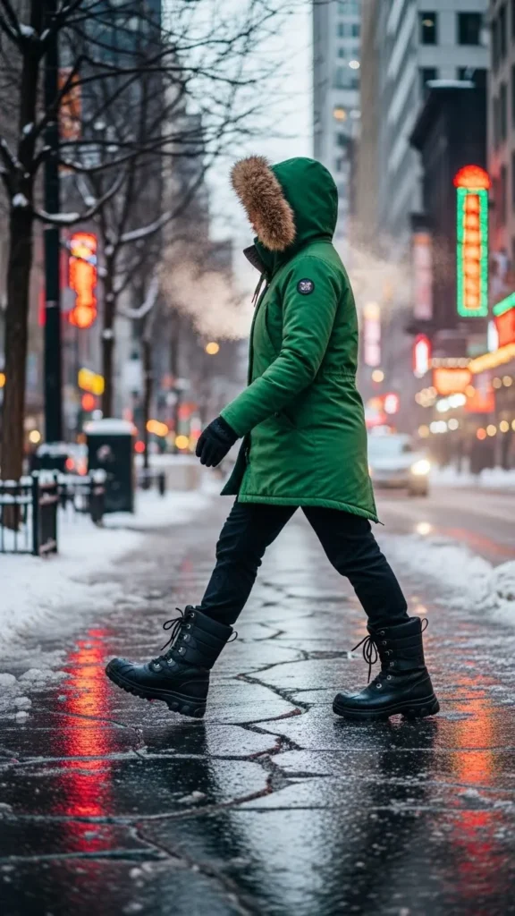 For wet and wintry weather, a parka jacket combined with waterproof boots offers unbeatable protection. Choose simple black or dark-colored boots for easy matching. Pair with insulated pants or jeans and thermal layers. This outfit is perfect for commuters or those spending time outdoors. Check clearance aisles for deals on waterproof boots, and use waterproofing sprays on older boots to keep water at bay.