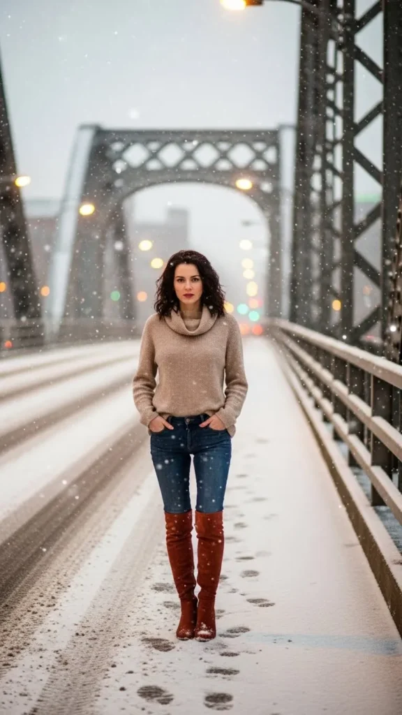 High-ankle boots highlight the simplicity of a turtleneck sweater and skinny pants or jeans. This look impresses with its minimalism and warm textures. Stick with earth tones or soft pastels for a gentle winter feel. Layer with light jackets or shawls depending on chill levels. You can often find affordable boots that look expensive by checking online marketplaces for secondhand finds.